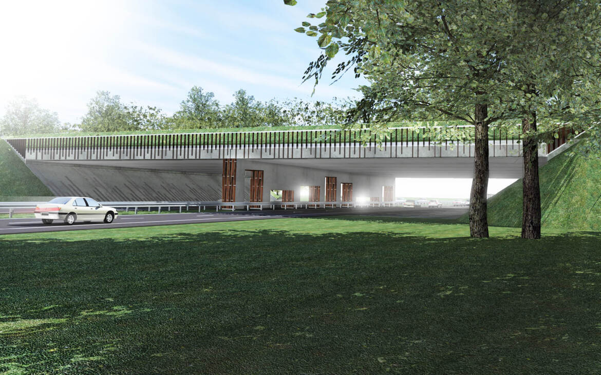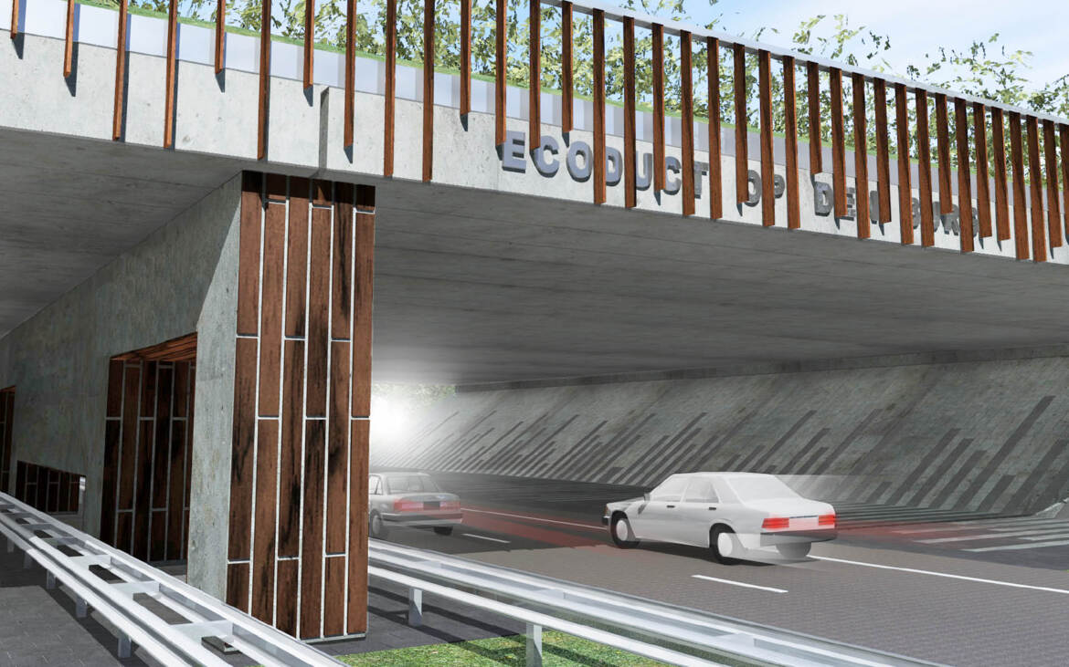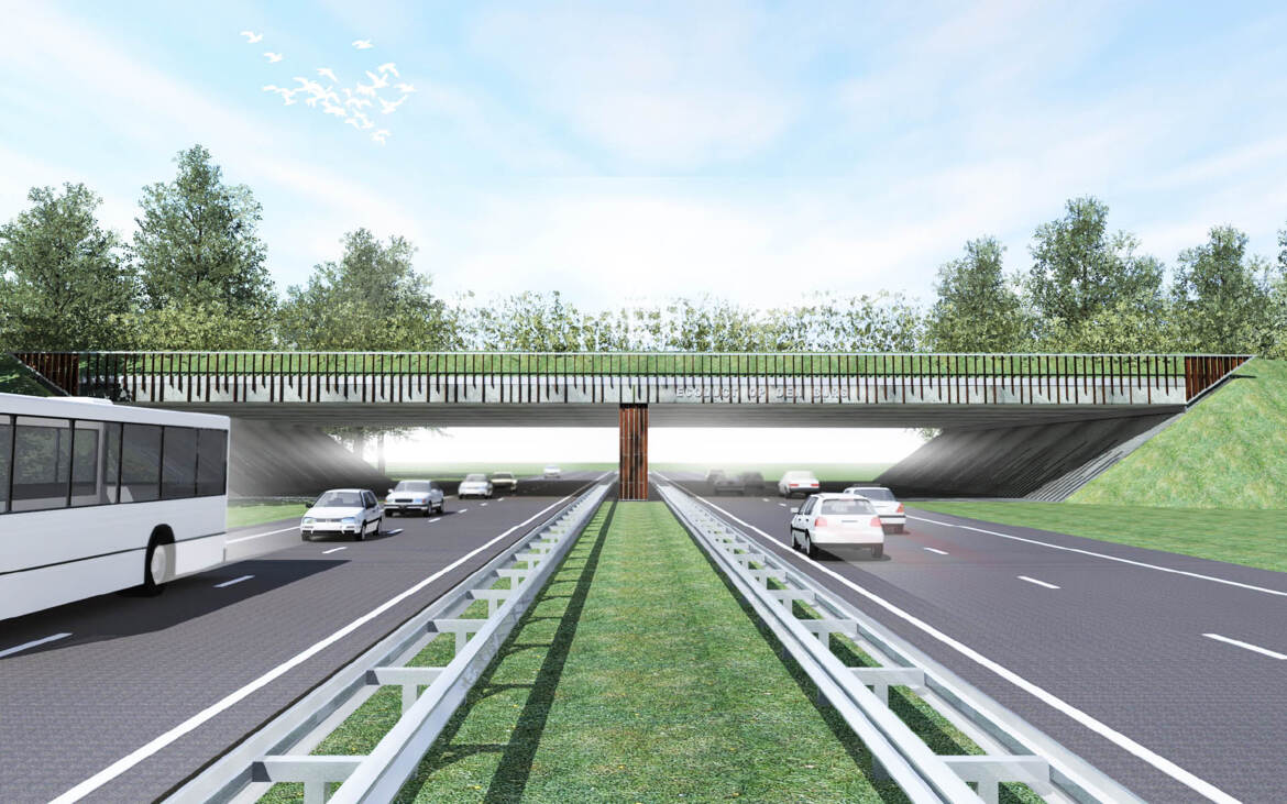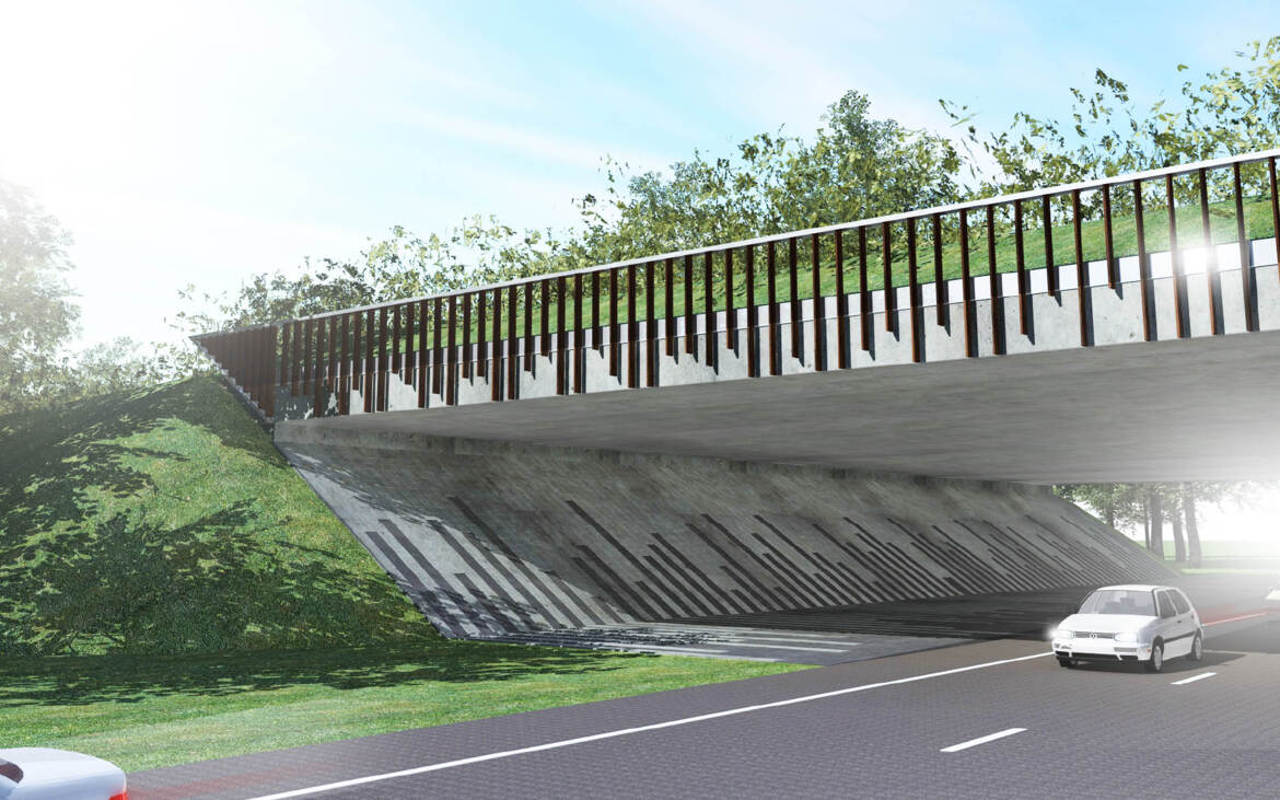 Het ecoduct Op den Burg over de A77 bij Gennep is uitgevoerd met betonnen prefabliggers. De hekwerken zijn gemaakt van FSC-hout en hebben een karakteristiek ritme dat terugkomt in de taludbekleding en ondersteuningen van het kunstwerk.