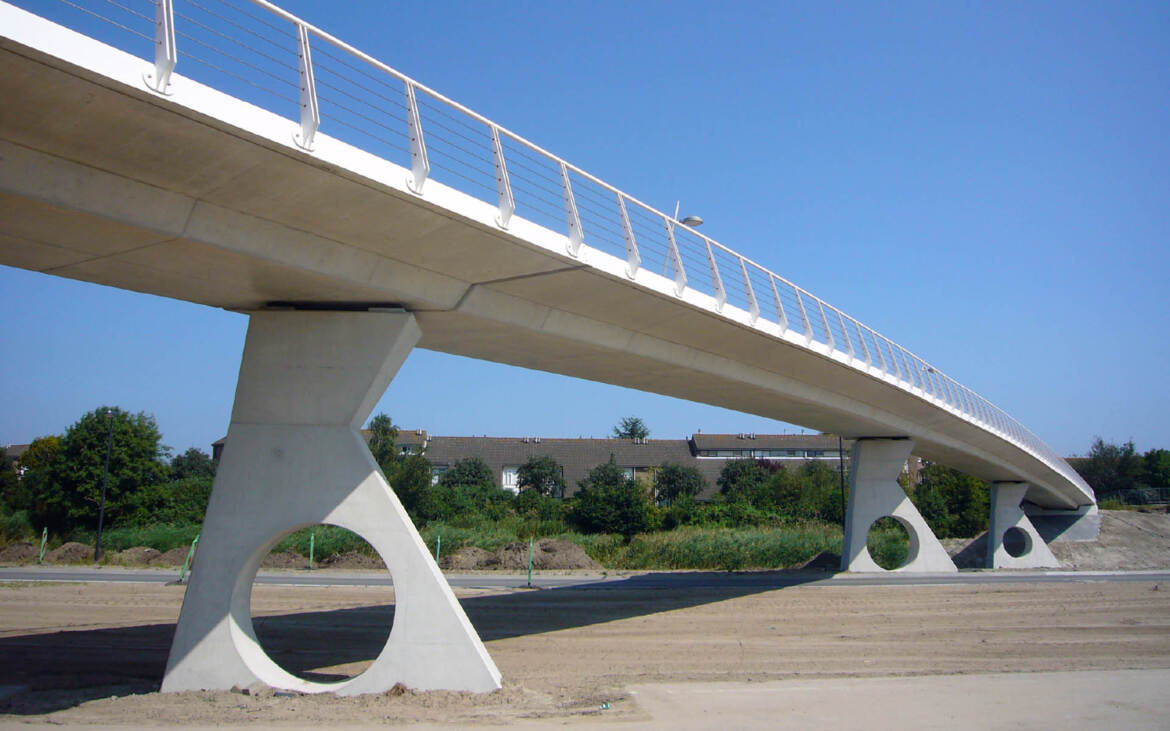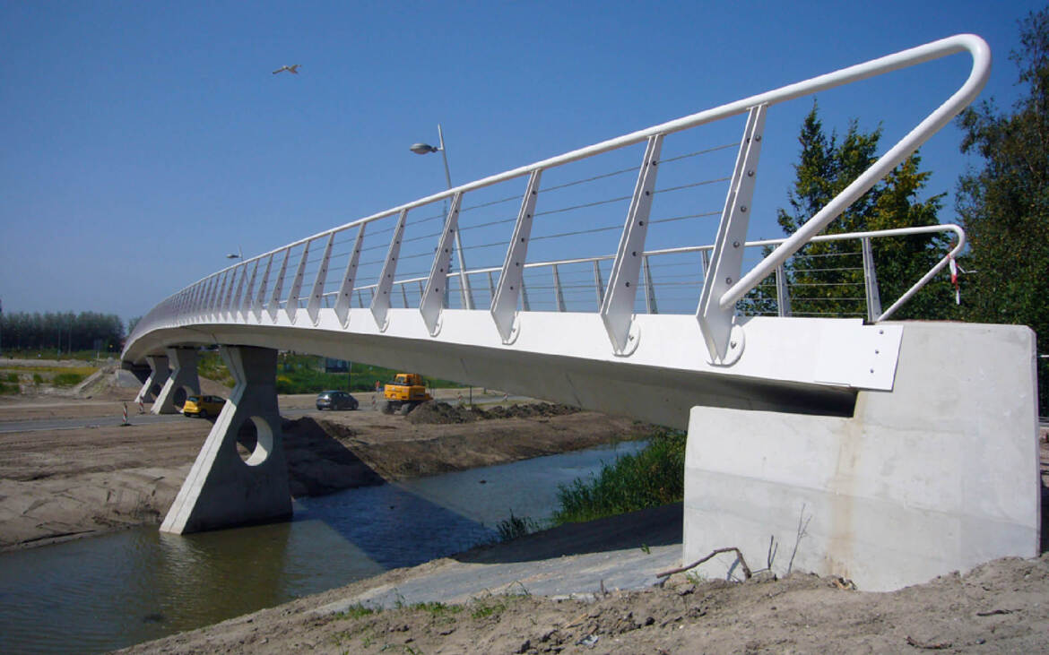De elegante curves van de twee nieuwe betonnen Houtribbruggen in Lelystad beelden de veerkracht van een sprong uit. Lange tijd was de dijk aan het Markermeer de grens van Lelystad, maar sinds een paar jaar wordt buitengaats gewerkt aan de wijk Bataviahaven. De architectonische verbinding tussen de ‘oude stad’ en de nieuwe wijk wordt gevormd door de twee Houtribbruggen, beide voor langzaam verkeer. Bijzonder aan het realisatieproces is dat de snelheid van de sprong – nu verstild in het beton – is vertaald in een dynamisch traject, waardoor de kunstwerken in korte tijd zijn verrezen.