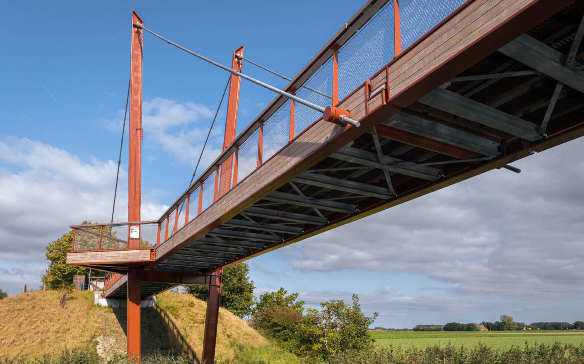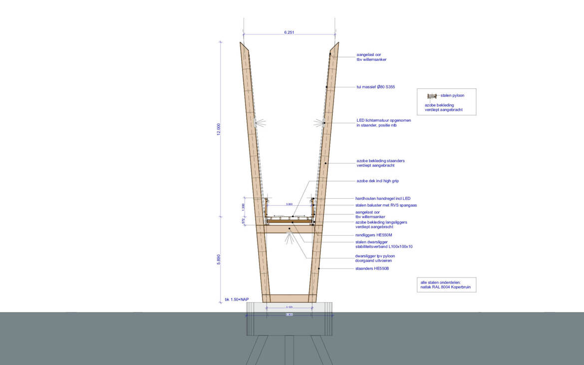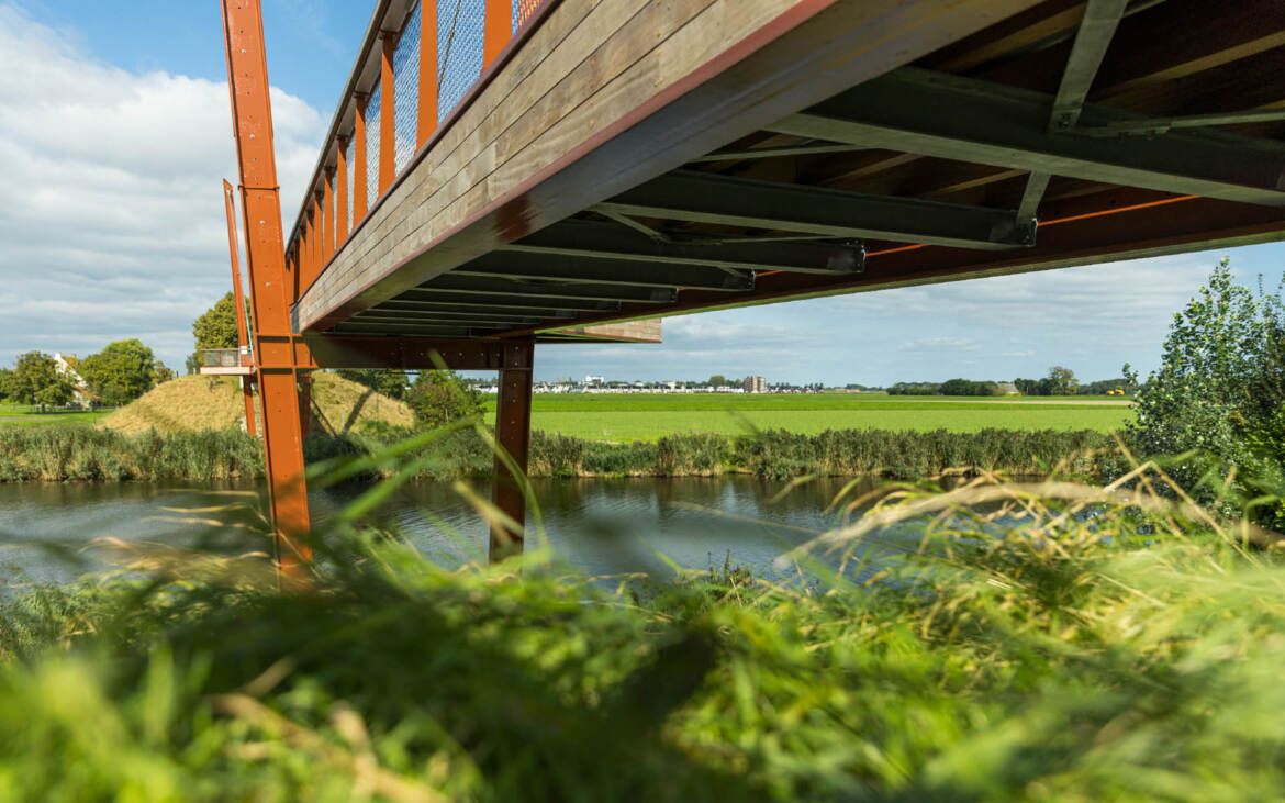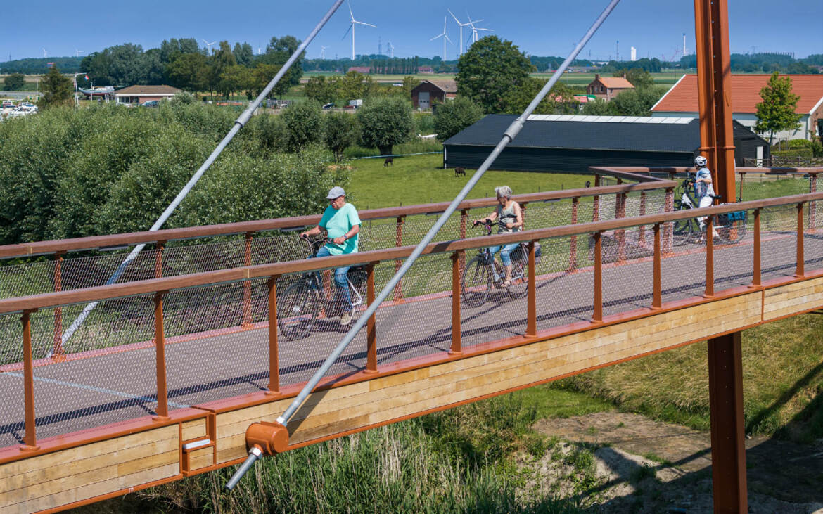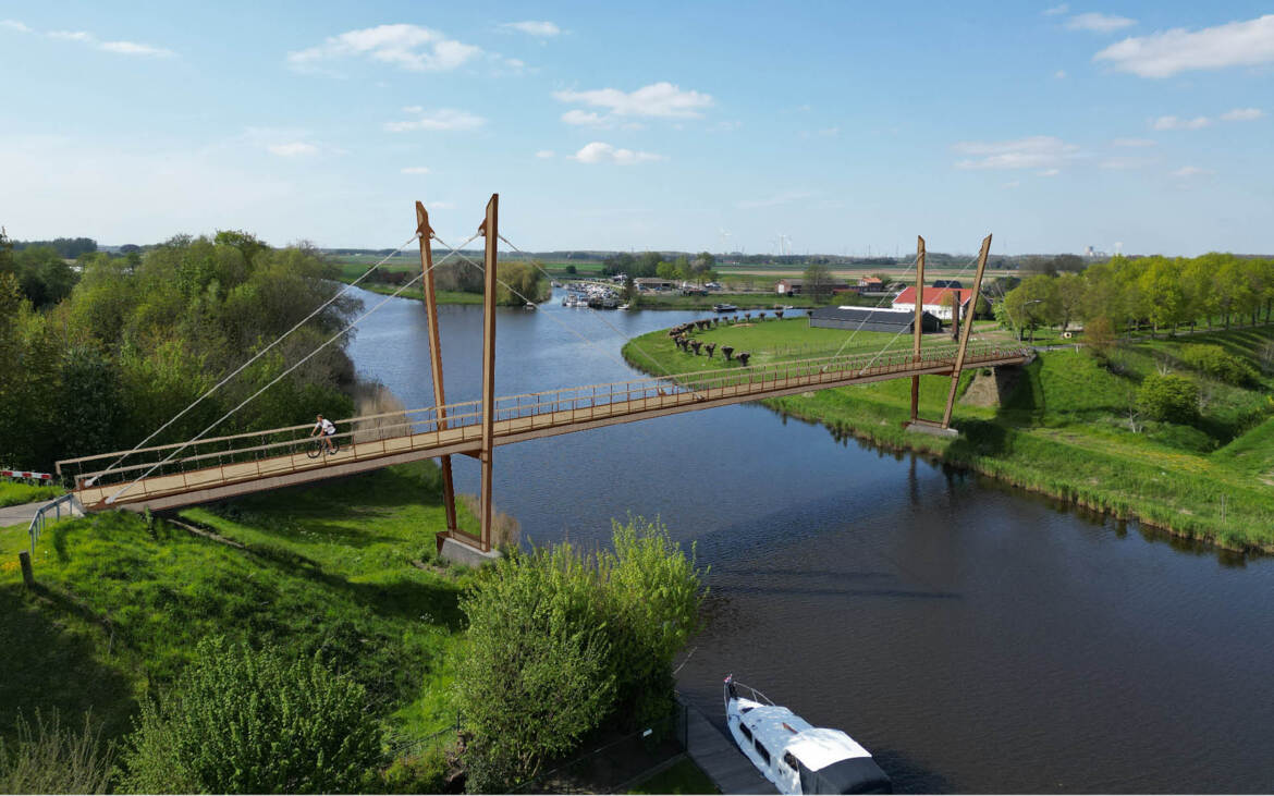 In de basis is het ontwerp van de brug op een sobere en functionele wijze opgezet en maakt de oversteek op de meest efficiënte wijze door middel van een stalen tuiconstructie op basis van de bestaande funderingspunten. Het ontwerp is een eigentijdse versie van de oude brug met een elegantere en transparantere en circulaire vormgeving en detaillering maar met behoud van het silhouet en kwaliteiten als landmark. De brug heeft een recreatief karakter door de veelvuldige toepassing van hout in de afwerking die het verblijf op de brug aangenaam maken: een houten dek, een houten invulling van de pylonen en een houten handregel die plezierig is om vast te houden en op te leunen. Leunend op de handregel kunnen de gebruikers genieten van het spectaculaire uitzicht over het landschap. De transparante vormgeving van de leuning versterkt de beleving dat men één geheel vormt met de prachtige groen-blauwe wereld van de rivier. Enkele goene led-spots zorgen voor een subtiele verlichting van de binnenzijde van de pylonen waarmee de brug ook in de avond zichtbaar is. De brug bestaat voor maar liefst voor 80% uit hergebruikte materialen.
