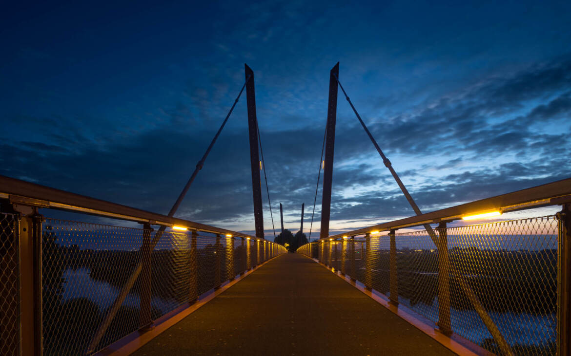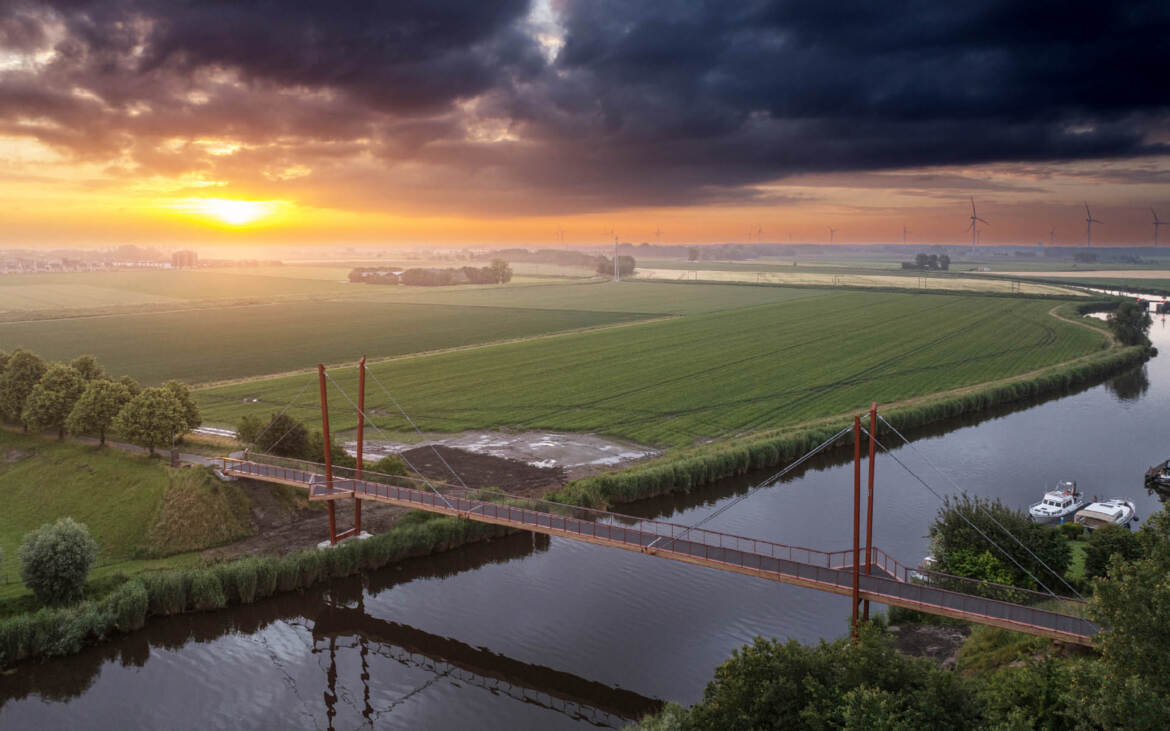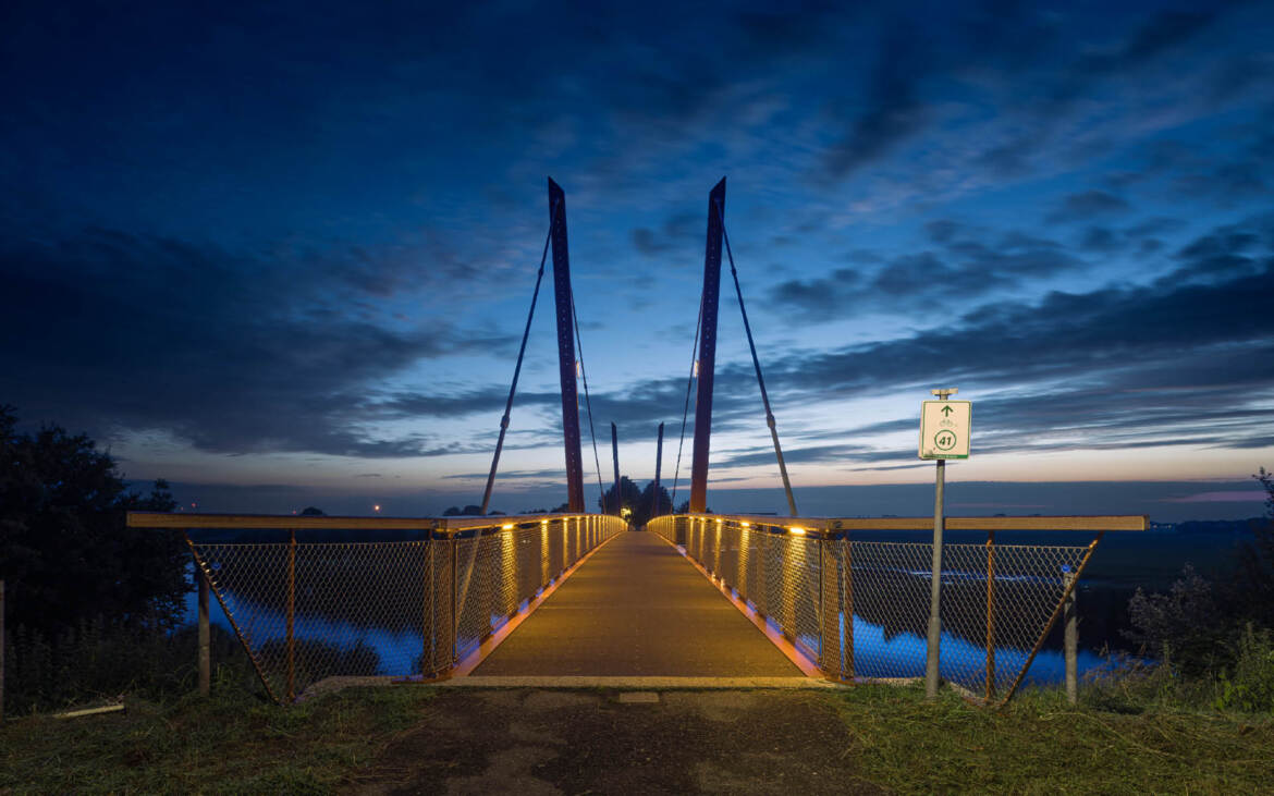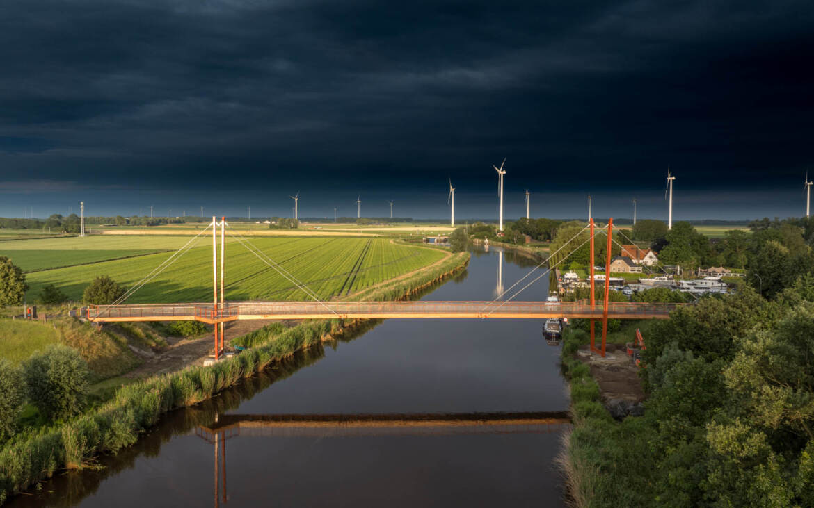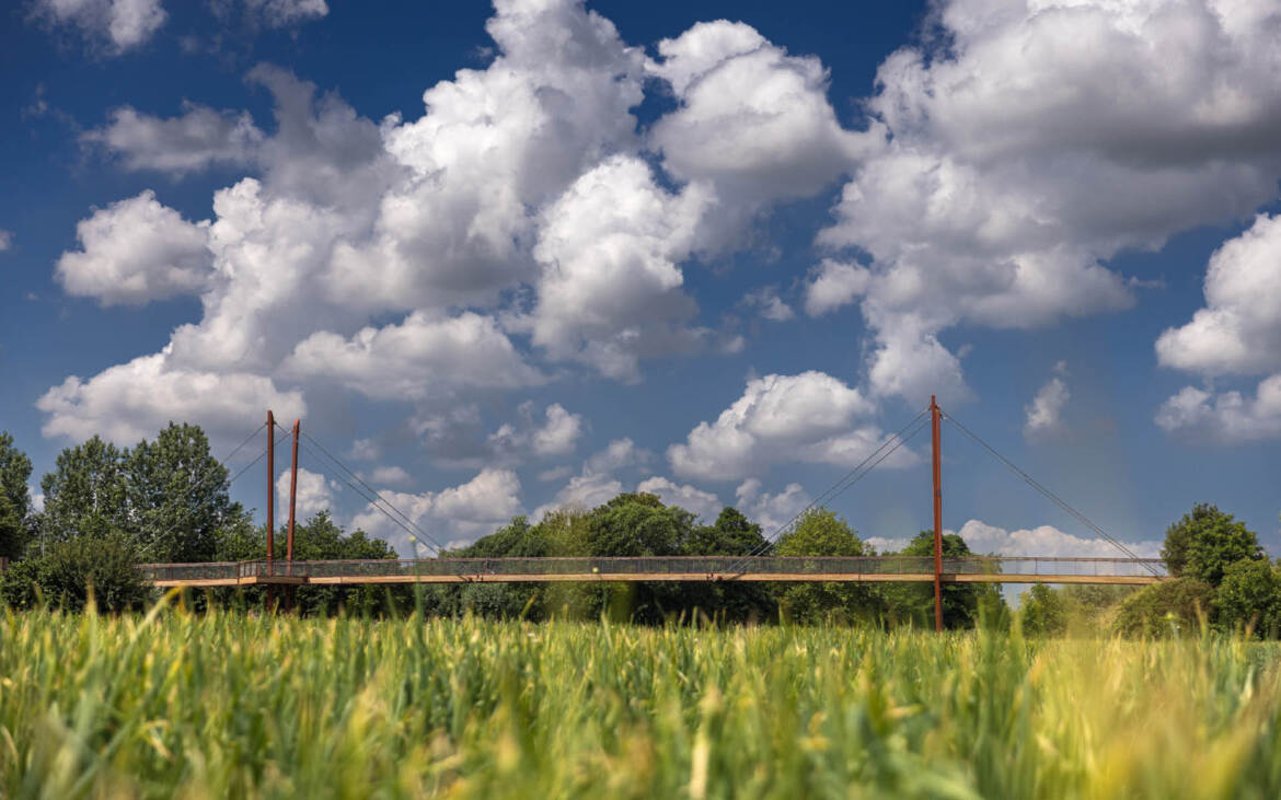 In de basis is het ontwerp van de brug op een sobere en functionele wijze opgezet en maakt de oversteek op de meest efficiënte wijze door middel van een stalen tuiconstructie op basis van de bestaande funderingspunten. Het ontwerp is een eigentijdse versie van de oude brug met een elegantere en transparantere en circulaire vormgeving en detaillering maar met behoud van het silhouet en kwaliteiten als landmark. De brug heeft een recreatief karakter door de veelvuldige toepassing van hout in de afwerking die het verblijf op de brug aangenaam maken: een houten dek, een houten invulling van de pylonen en een houten handregel die plezierig is om vast te houden en op te leunen. Leunend op de handregel kunnen de gebruikers genieten van het spectaculaire uitzicht over het landschap. De transparante vormgeving van de leuning versterkt de beleving dat men één geheel vormt met de prachtige groen-blauwe wereld van de rivier. Enkele goene led-spots zorgen voor een subtiele verlichting van de binnenzijde van de pylonen waarmee de brug ook in de avond zichtbaar is. De brug bestaat voor maar liefst voor 80% uit hergebruikte materialen.