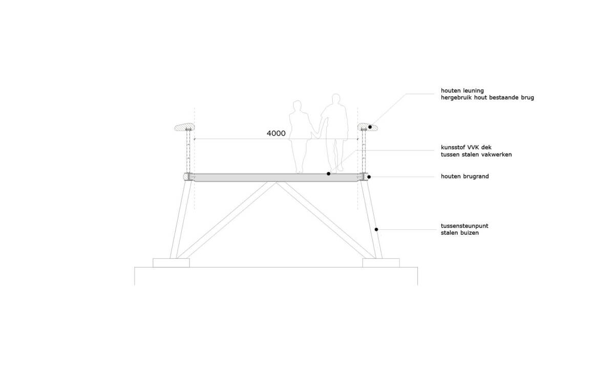 Deze karakteristieke voet- fietsbrug vervangt een bestaande brug in Almere-Haven, de zogenaamde Hangbrug. De brug vormt door het opvallende ontwerp een herkenningspunt voor de passant. De eigentijdse brug verbindt het water van dit stadsdeel met het Weerwater in Almere-Stad. De vakwerkligger als onderdeel van de leuning maakt het mogelijk om een zeer slank dek te maken waardoor onder meer de hellingen zijn geminimaliseerd, de doorvaart van recreatievaartuigen is behouden en doorzicht onder de brug gemaximaliseerd. De stalen vakwerkbrug is afgewerkt met circulair hergebruikt hardhout afkomstig uit de vorige brug op deze locatie. Het brugdek is gemaakt van vezel versterkt kunststof, de bestaande betonnen voeten zijn in het ontwerp gehandhaafd.