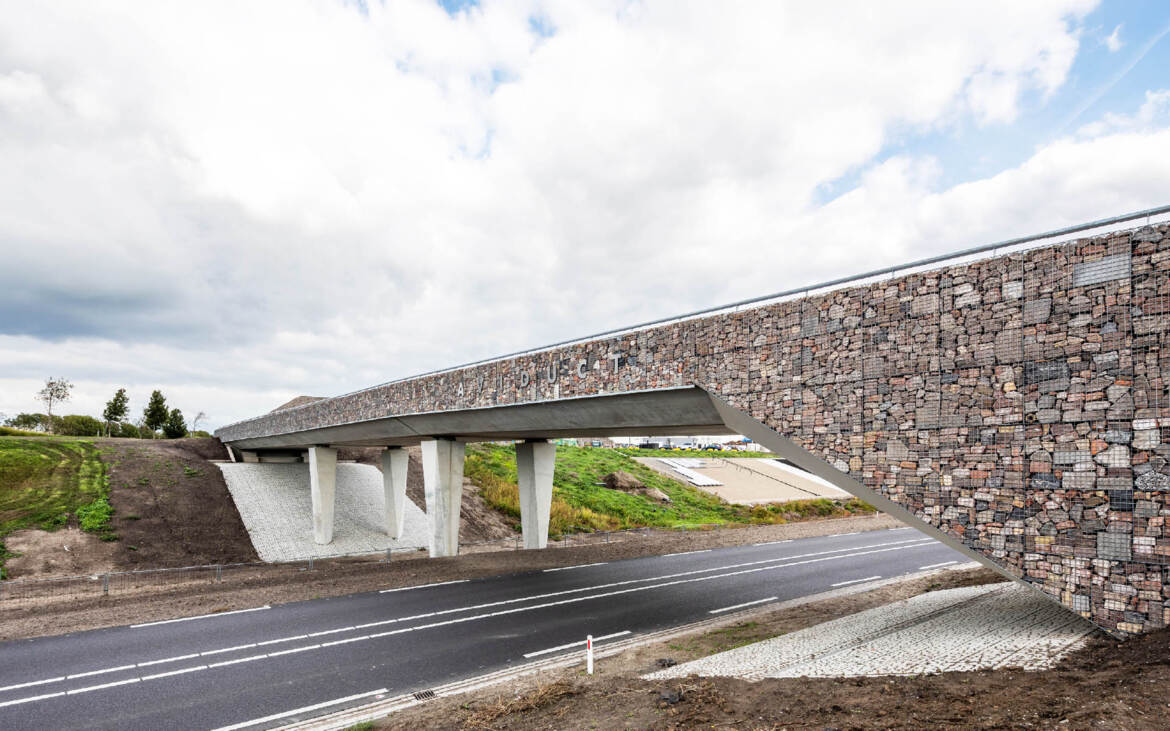 Viaduct Nauerna - schanskorven gevuld met hergebruikte steenachtige materialen in brugrand en verticale wanden;